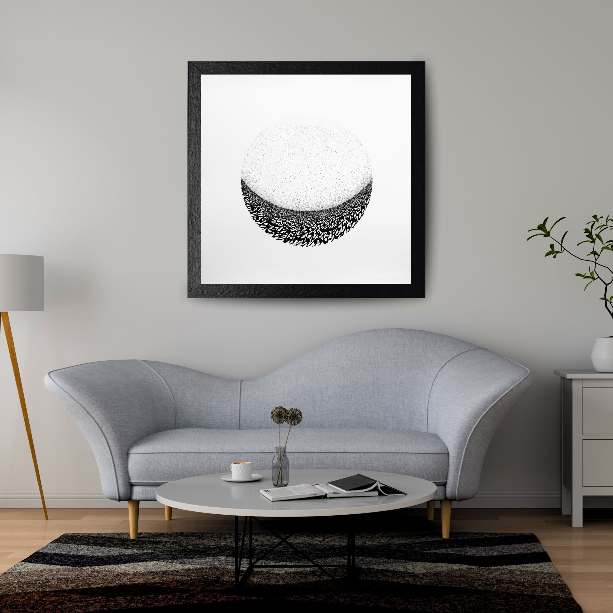 The Horizon of Hope is a visual manifestation of the delicate balance between despair and longing. In this work, the circular form acts as a gateway, where the dense, earthly weight of ink meets a transcendent, stippled atmosphere of light. Inspired by the poetry of Bismil Bakharzi, the composition illustrates the moment where the ‘dark smoke’ of existence reaches the luminous countenance of the Moon. It is a meditative study of the space between what is lost and what is sought, captured through the rhythmic precision of calligraphy and pointillism.