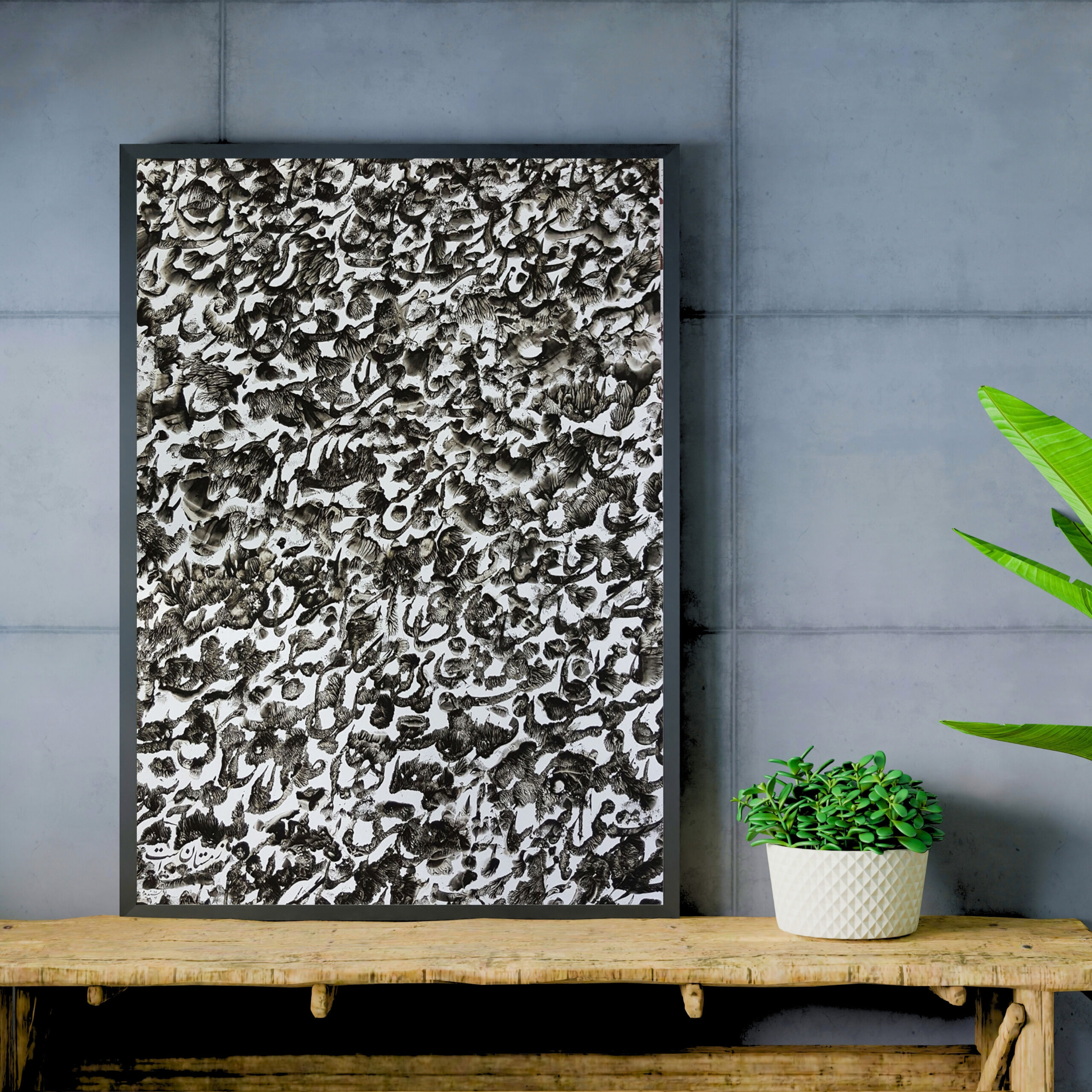 Inspired by the masterpiece of Mehdi Akhavan-Sales, this work is a visual translation of the poem ‘Winter’ (Zemestan). Through a dense and layered composition, the artist captures the cold, somber atmosphere of a world where ‘breath becomes a dark cloud’ and ‘heads are tucked into collars.’ The intricate, overlapping calligraphy mirrors the social and emotional isolation described in the poem, transforming the literary rhythm into a haunting visual landscape. It is a profound exploration of stillness and resilience, where ink on paper reflects the frost of a frozen era.
