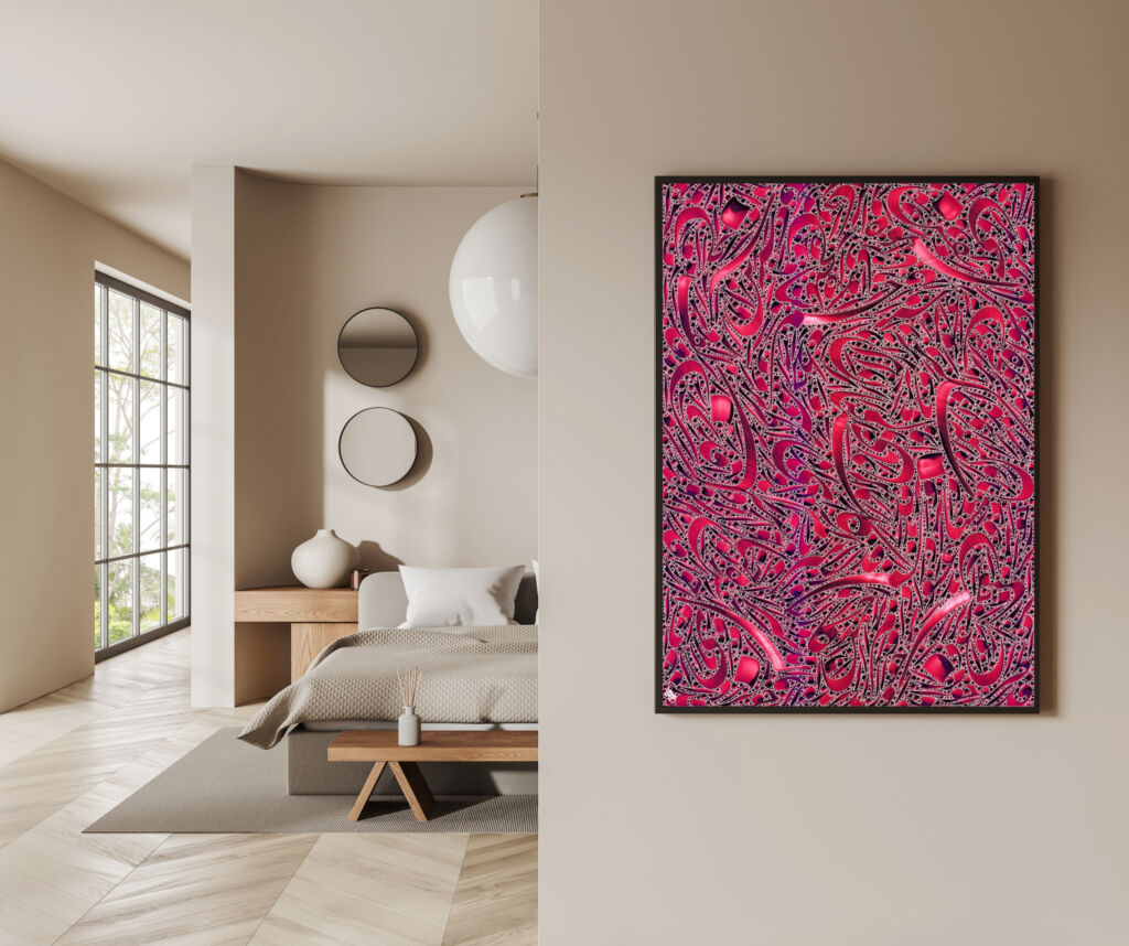 Inspired by the romantic lyricism of Hafez, Rosy is a vibrant celebration of beauty and divine grace. The artist constructs a lush, intricate tapestry of crimson and rose-toned calligraphy, echoing the poet’s imagery of a “fragrant flower garden.” By layering delicate, rhythmic scripts into a dense field of color, the work transforms classical verse into a contemporary sensory experience. The fluid movement of the ink captures the softness of a petal and the elegance of the beloved’s presence, creating a visual harmony that resonates with the sweetness of the soul.
