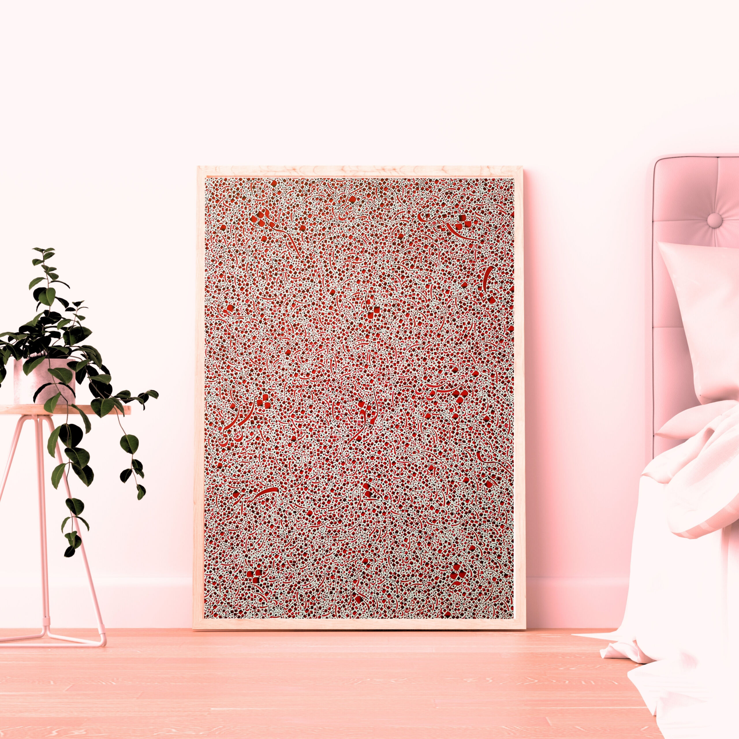 Inspired by the contemplative poetry of Sohrab Sepehri, this work is a visual exploration of existential solitude within the “silent era.” The artist employs a mosaic-like composition, where vibrant patches of green, yellow, and earthy ochre are overlaid with dense, rhythmic calligraphy. This “textural map” of the mind reflects the poet’s feeling of being “lonelier than the taste of a song.” By compartmentalizing color and script, the piece captures the fragmented nature of modern perception, where individual moments of clarity emerge from a complex, intertwined reality.