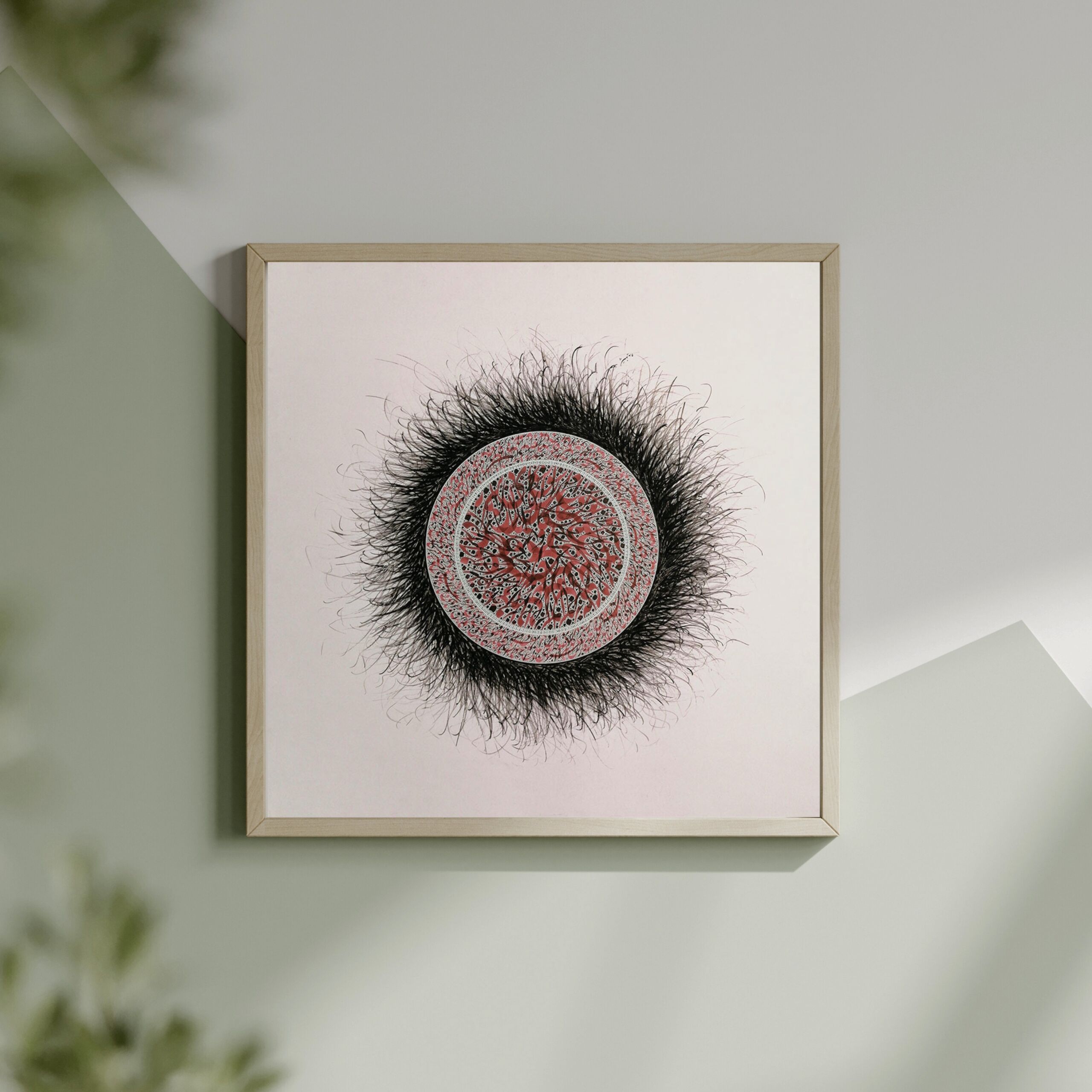 The Universe is a powerful visual metaphor for the birth and expansion of all things. The central core, a masterpiece of intricate red and black calligraphy, acts as a singular point of origin from which life radiates. The surrounding chaotic, hair-thin lines represent the infinite reach of the cosmos and the unseen forces that bind existence together. By merging the disciplined structure of the circle with the wild energy of the periphery, the artist captures the dual nature of the universe: perfect order within a vast, unfolding mystery.